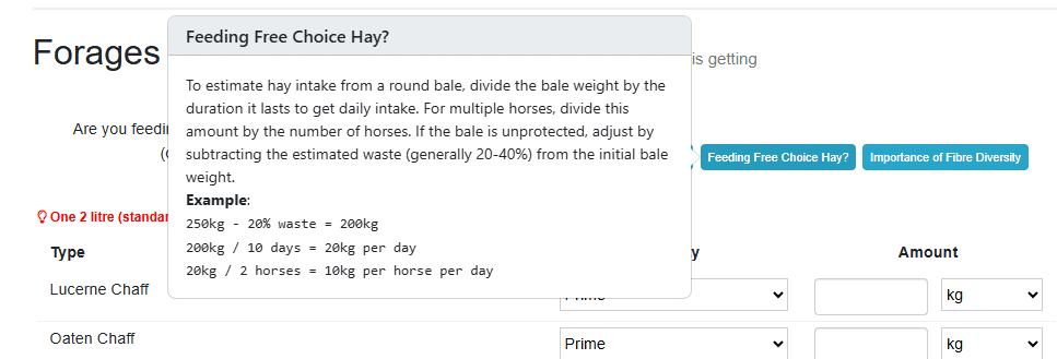 Enter information about their pasture and any hay, fibres or chaffs you are feeding.